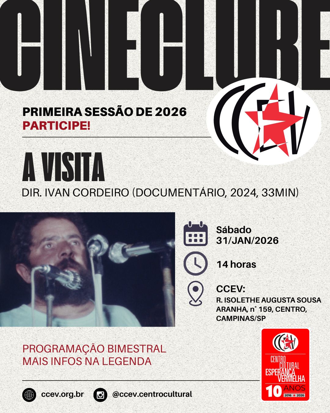 E o primeiro filme a ser exibido, no dia 31/01/2026, às 14h, é “A Visita”, de Ivan Cordeiro (2024, 33min). Esse documentário é formado por imagens de uma viagem do presidente Lula ao Recife em 1982. Acompanhamos alguns momentos íntimos e raros do futuro presidente, em um contexto de fim da ditadura militar e de formação do Partido dos Trabalhadores.
