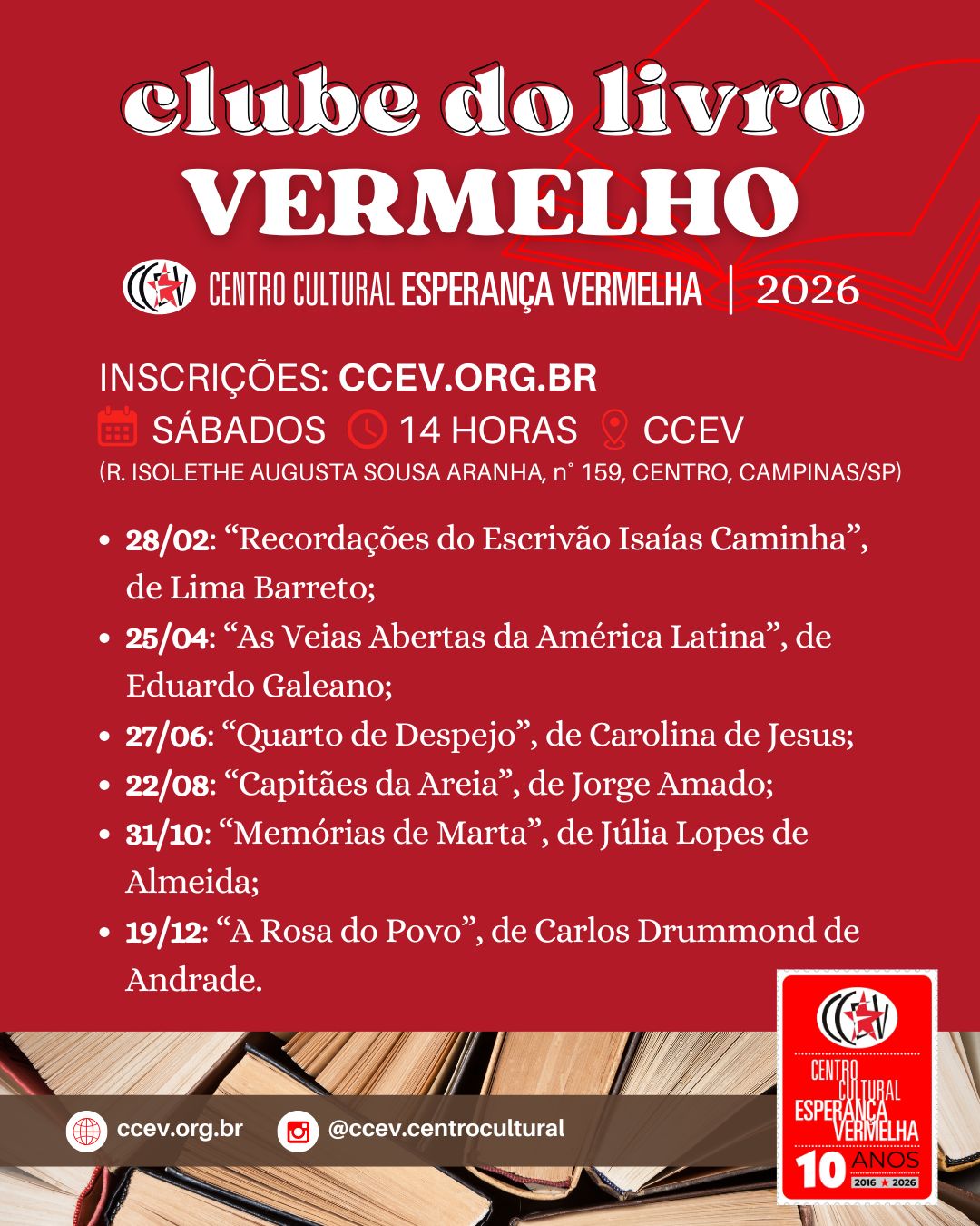 O CCEV anuncia o Clube do Livro Vermelho! Em 2026, realizaremos uma série de encontros para discutir obras da literatura e da cultura, destacando aquelas que trazem um olhar aguçado sobre questões políticas e sociais marcantes da nossa história, questionando problemas sociais e às vezes propondo alguns caminhos de superação.